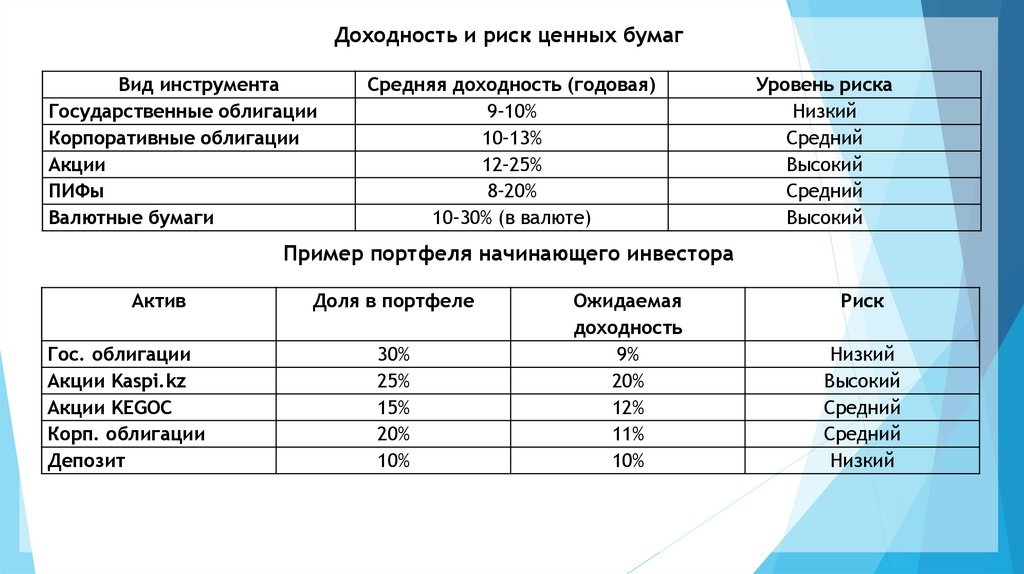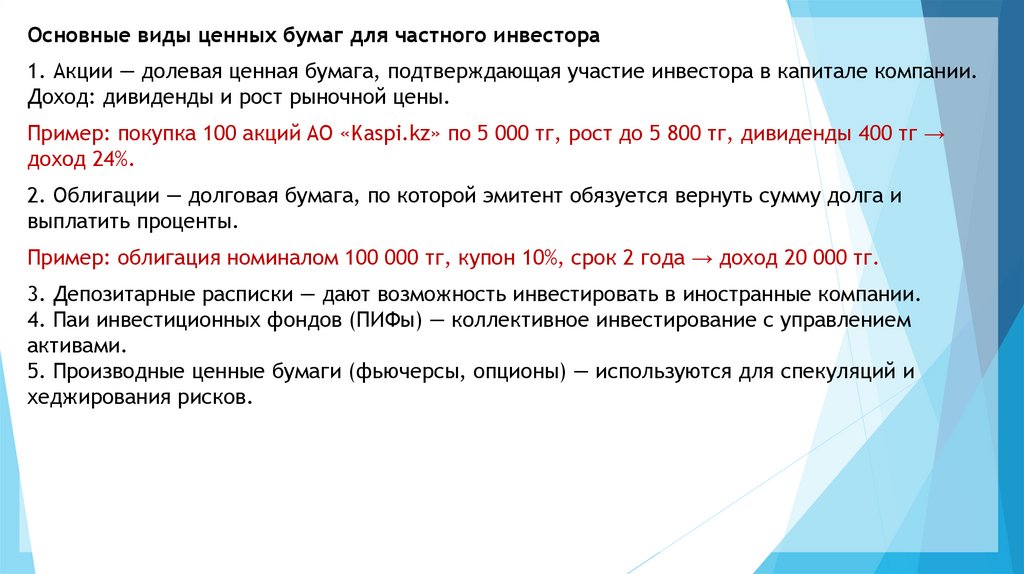 Пример: облигация номиналом 100 000 тг, купон 10%, срок 2 года → доход 20 000 тг.