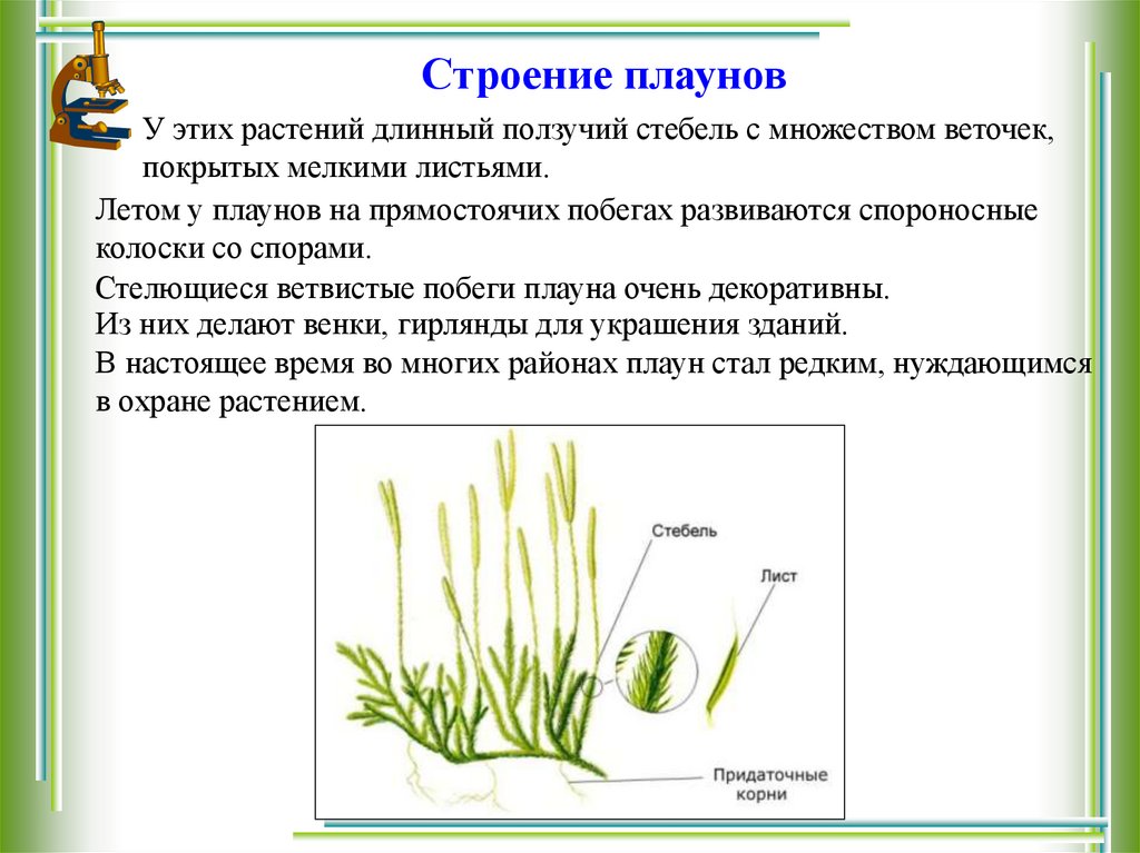 Строение плауновУ этих растений длинный ползучий стебель с множеством веточек,