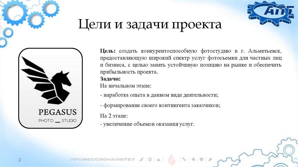 Цели и задачи проектаЦель: создать конкурентоспособную фотостудию в г. Альметьевск,