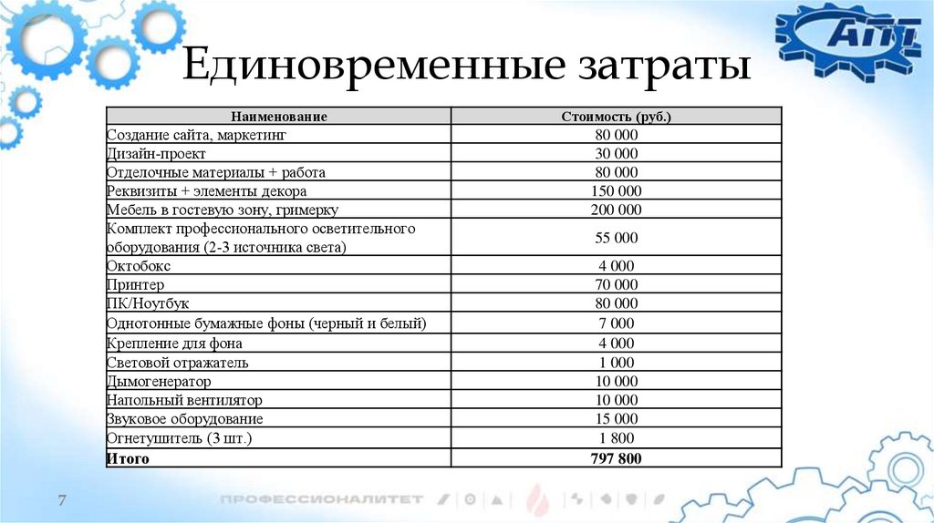 Единовременные затратыНаименование