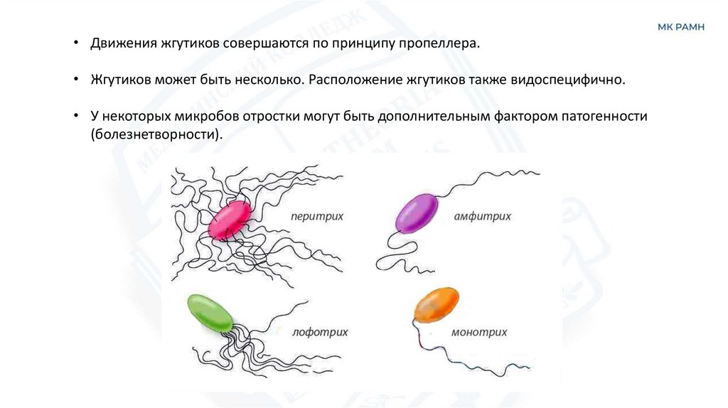 • Движения жгутиков совершаются по принципу пропеллера.• Жгутиков может быть несколько. Расположение жгутиков также видоспецифично.