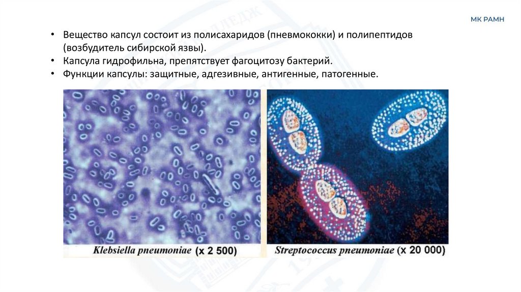 • Вещество капсул состоит из полисахаридов (пневмококки) и полипептидов(возбудитель сибирской язвы).
