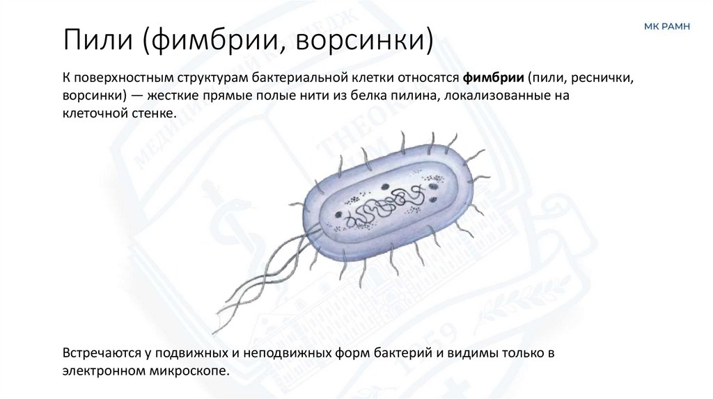 Пили (фимбрии, ворсинки)К поверхностным структурам бактериальной клетки относятся фимбрии (пили, реснички,