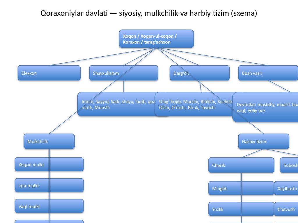 Qoraxoniylar davlati — siyosiy, mulkchilik va harbiy tizim (sxema)Xoqon / Xoqon-ul-xoqon /