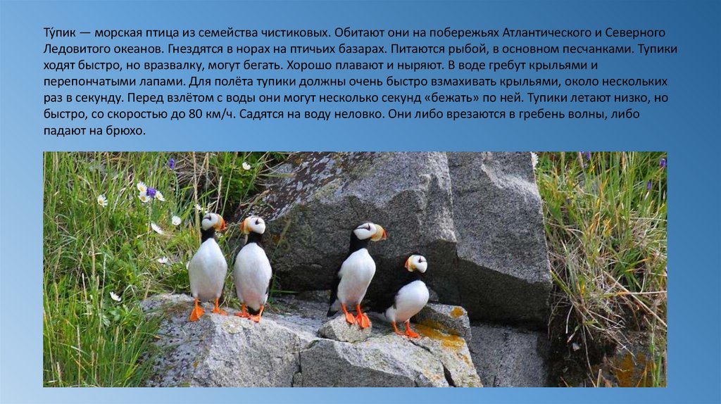 перепончатыми лапами. Для полёта тупики должны очень быстро взмахивать крыльями, около нескольких