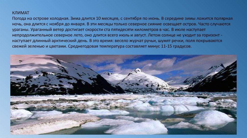 КЛИМАТПогода на острове холодная. Зима длится 10 месяцев, с сентября по июнь. В середине зимы ложится полярная