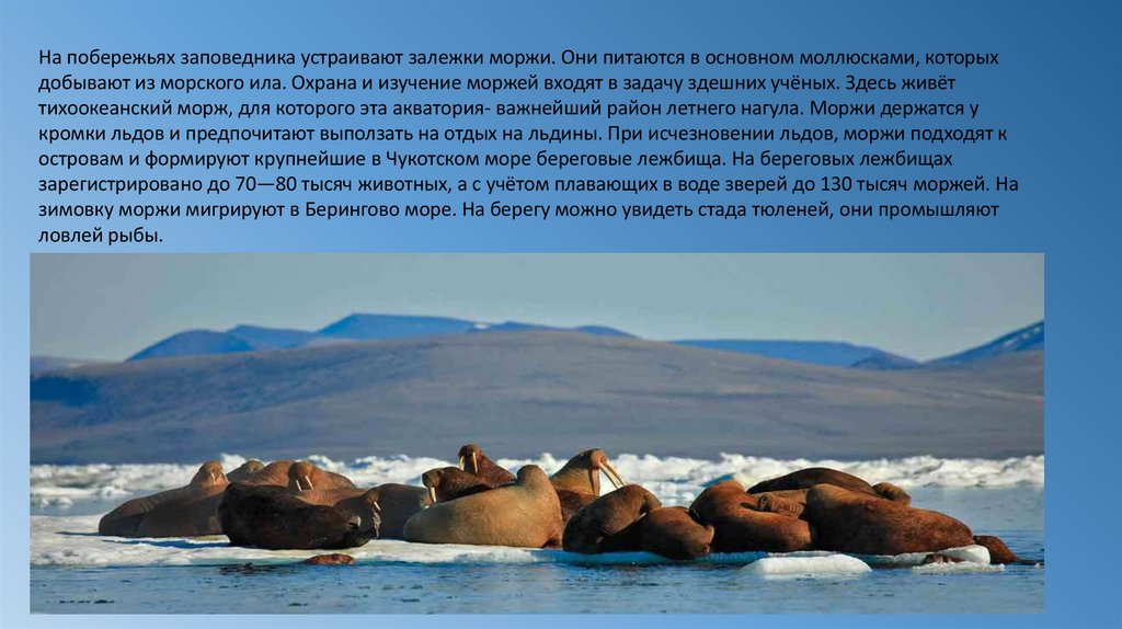 кромки льдов и предпочитают выползать на отдых на льдины. При исчезновении льдов, моржи подходят к