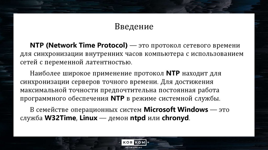 NTP (Network Time Protocol) — это протокол сетевого временидля синхронизации внутренних часов компьютера с использованием