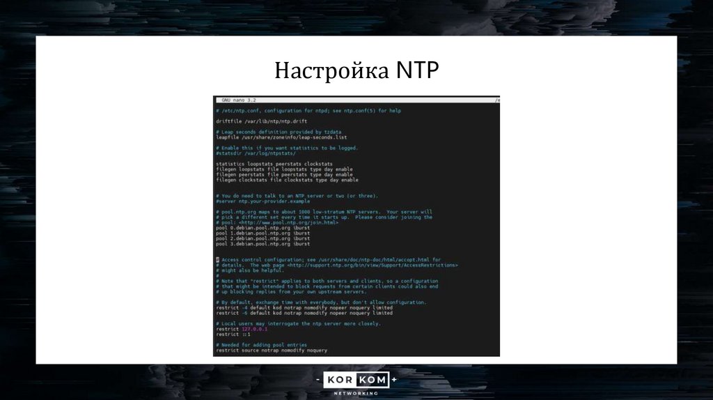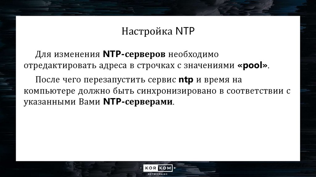 Для изменения NTP-серверов необходимоотредактировать адреса в строчках с значениями «pool».