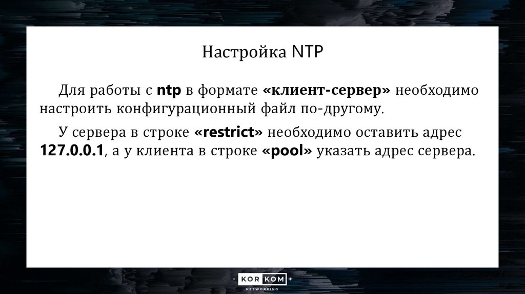 Для работы с ntp в формате «клиент-сервер» необходимонастроить конфигурационный файл по-другому.
