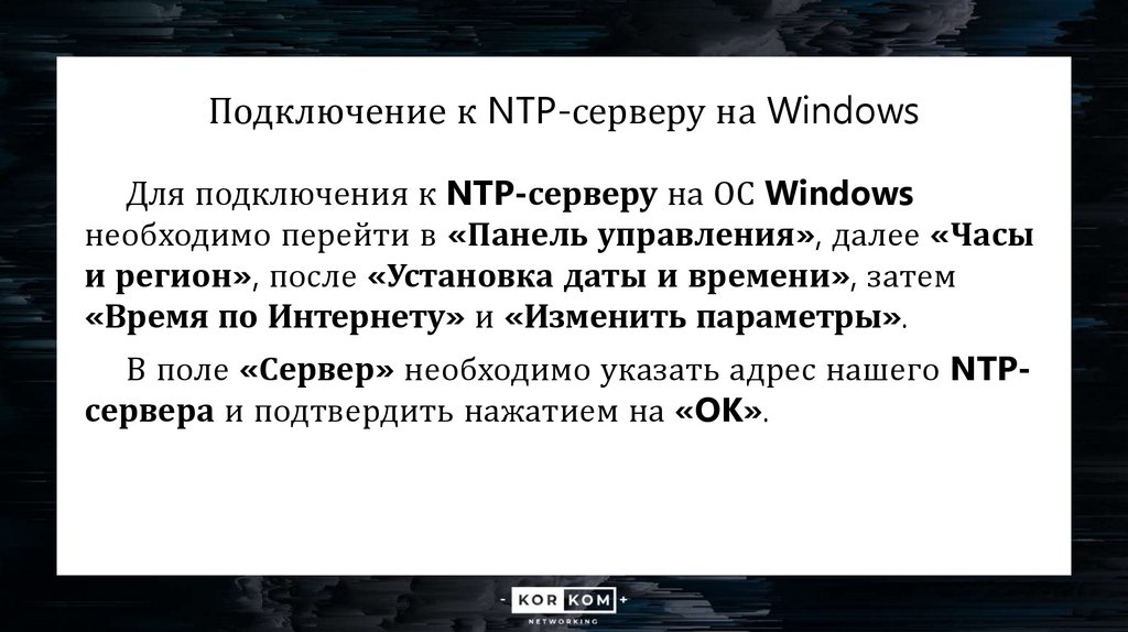 Для подключения к NTP-серверу на ОС Windowsнеобходимо перейти в «Панель управления», далее «Часы