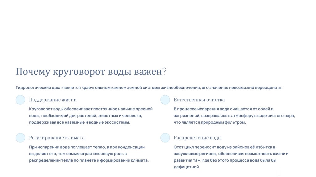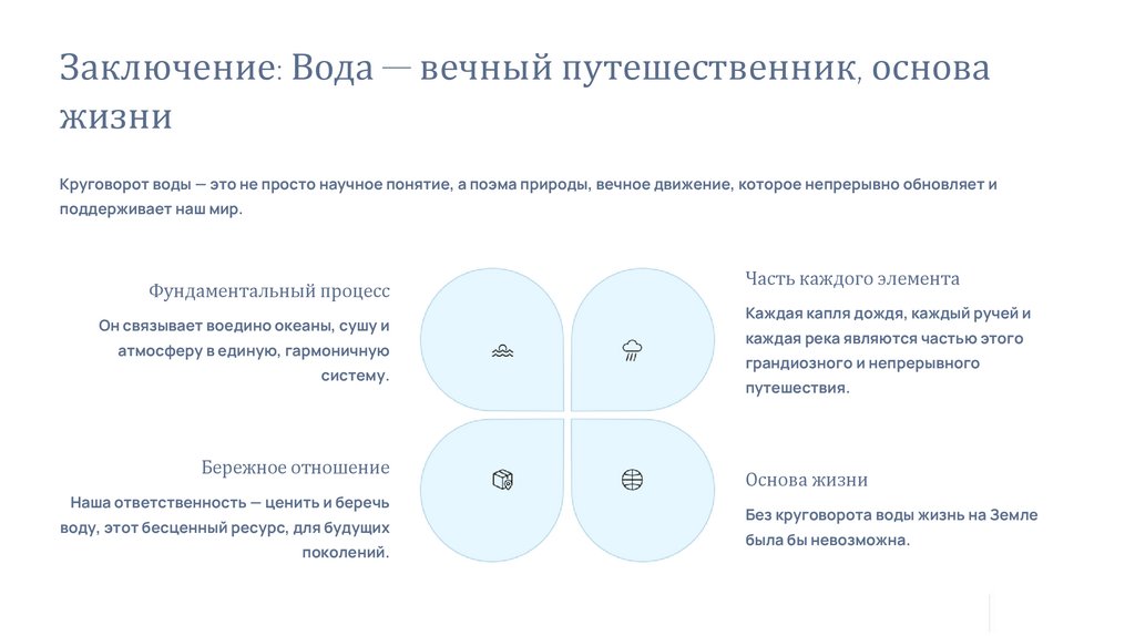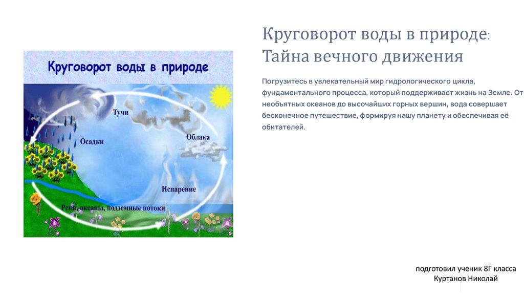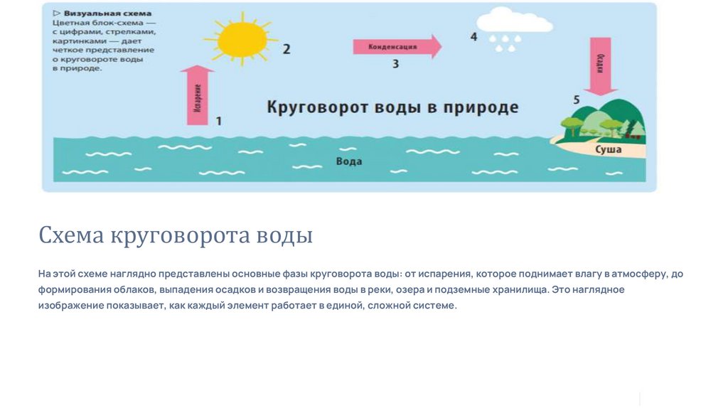 формирования облаков, выпадения осадков и возвращения воды в реки, озера и подземные хранилища. Это наглядное