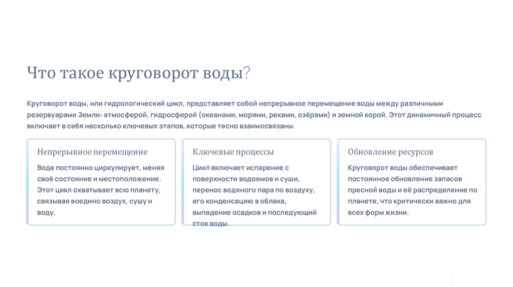 Что такое круговорот воды?Круговорот воды, или гидрологический цикл, представляет собой непрерывное перемещение воды между различными