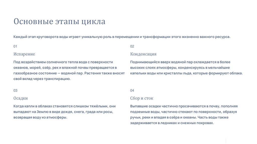 Основные этапы циклаКаждый этап круговорота воды играет уникальную роль в перемещении и трансформации этого жизненно важного ресурса.