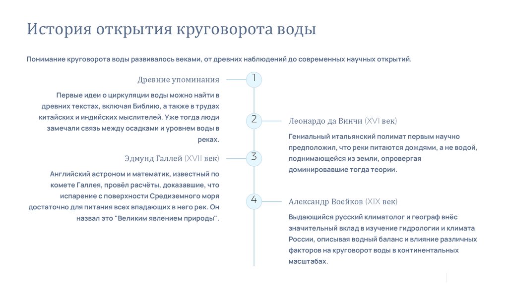 История открытия круговорота водыПонимание круговорота воды развивалось веками, от древних наблюдений до современных научных открытий.