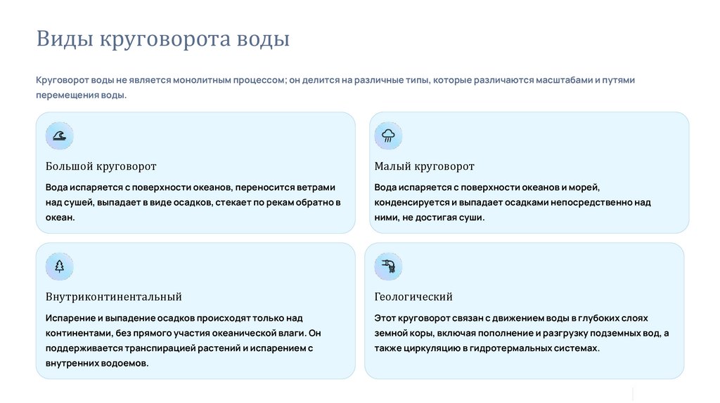 Виды круговорота водыКруговорот воды не является монолитным процессом; он делится на различные типы, которые различаются масштабами и путями