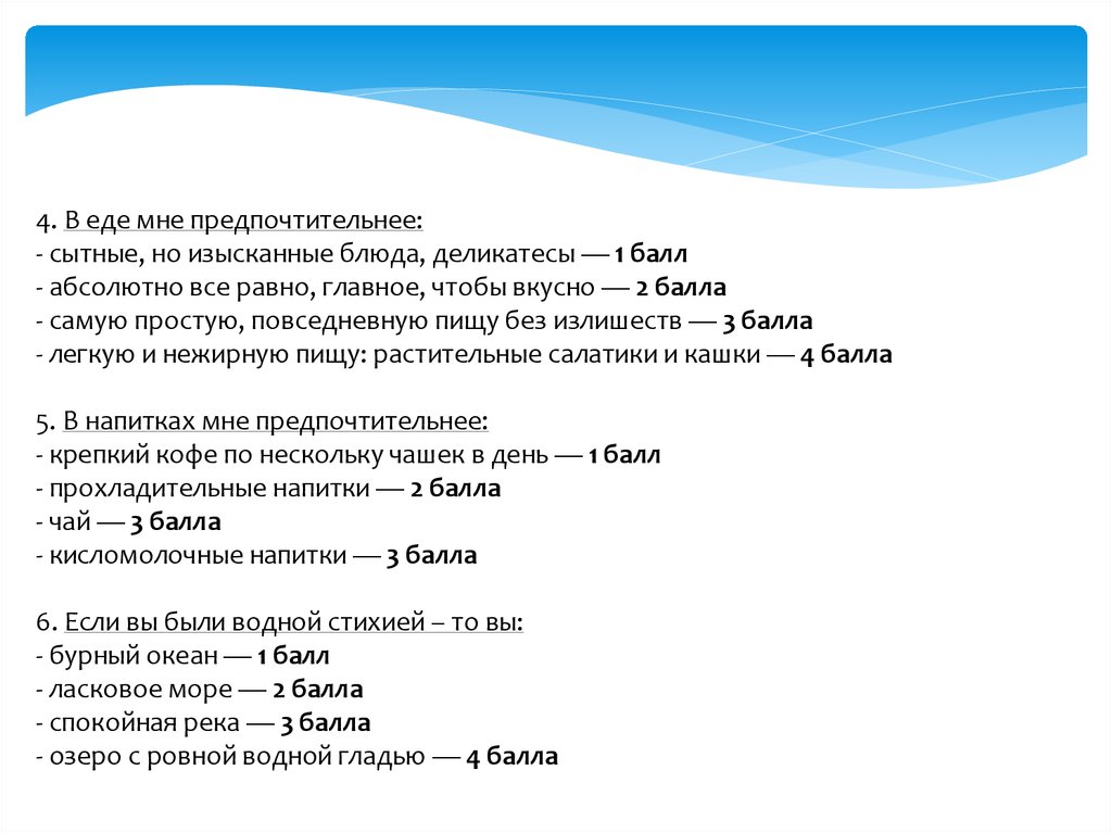 4. В еде мне предпочтительнее:- сытные, но изысканные блюда, деликатесы — 1 балл