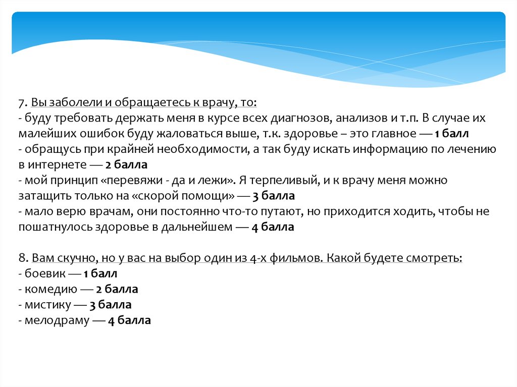 7. Вы заболели и обращаетесь к врачу, то:- буду требовать держать меня в курсе всех диагнозов, анализов и т.п. В случае их