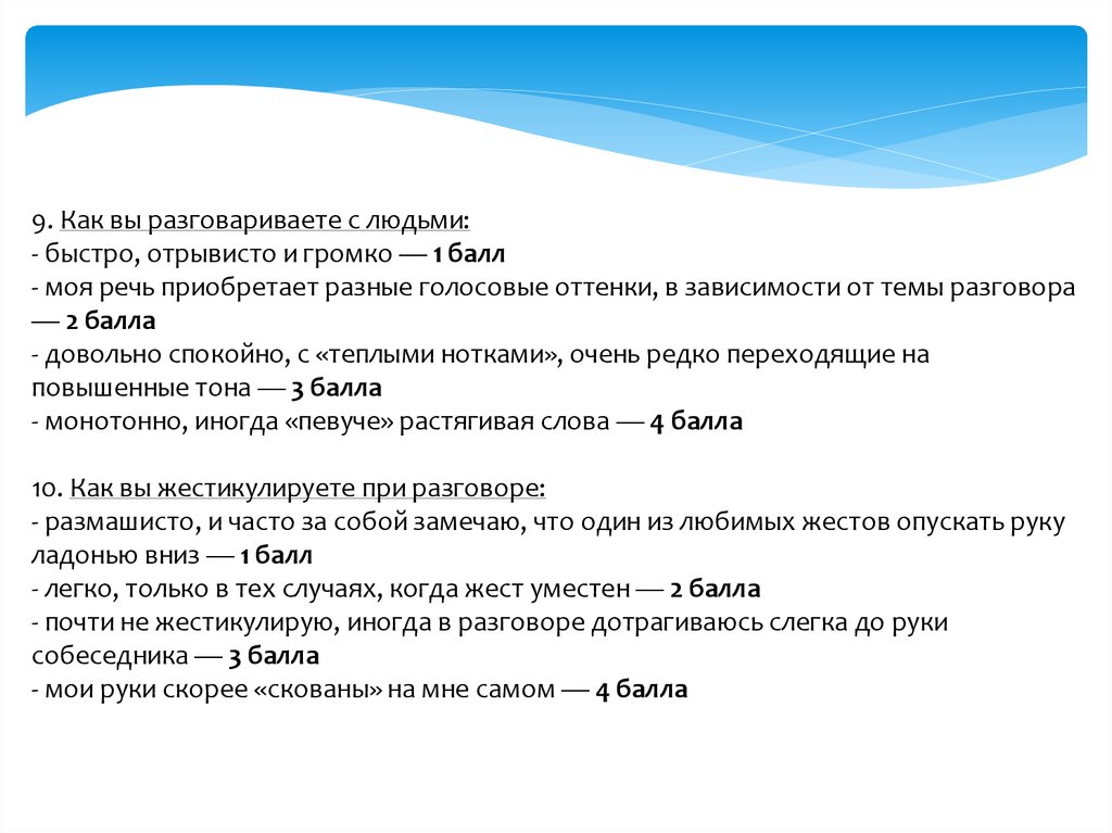 9. Как вы разговариваете с людьми:- быстро, отрывисто и громко — 1 балл