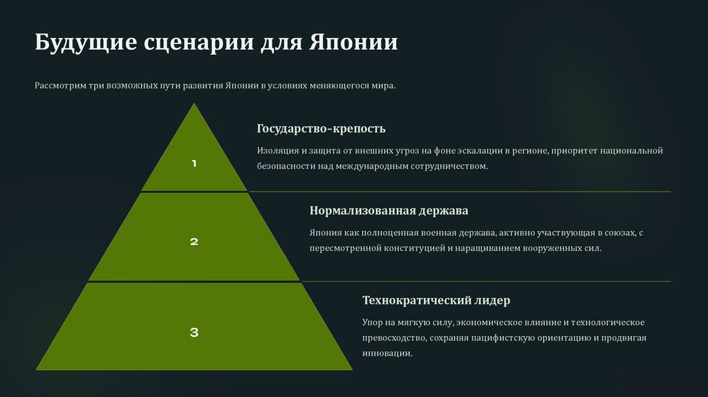 Будущие сценарии для ЯпонииРассмотрим три возможных пути развития Японии в условиях меняющегося мира.
