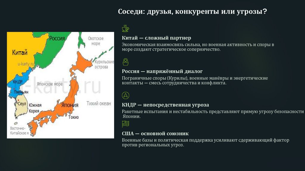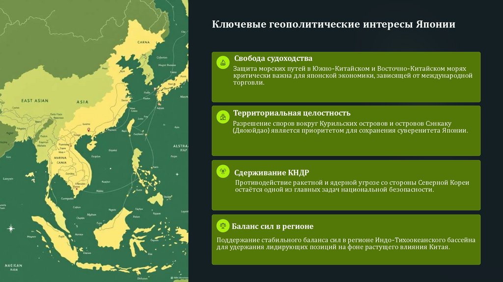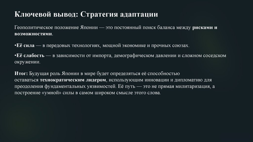 Ключевой вывод: Стратегия адаптацииГеополитическое положение Японии — это постоянный поиск баланса между рисками и
