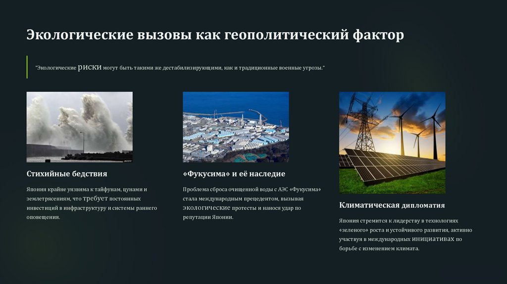 Экологические вызовы как геополитический фактор"Экологические риски могут быть такими же дестабилизирующими, как и традиционные военные угрозы."