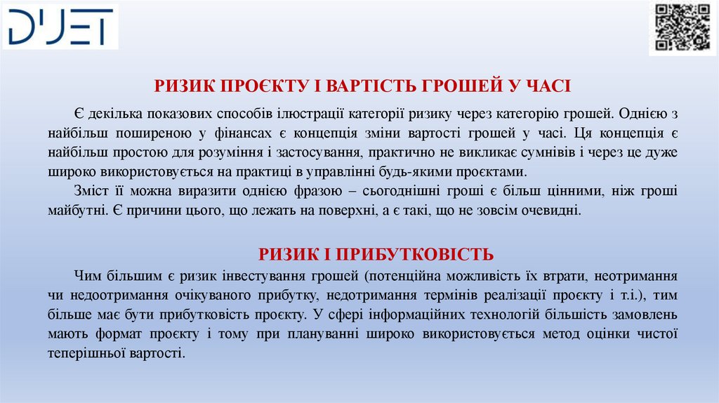 РИЗИК ПРОЄКТУ І ВАРТІСТЬ ГРОШЕЙ У ЧАСІЄ декілька показових способів ілюстрації категорії ризику через категорію грошей. Однією з