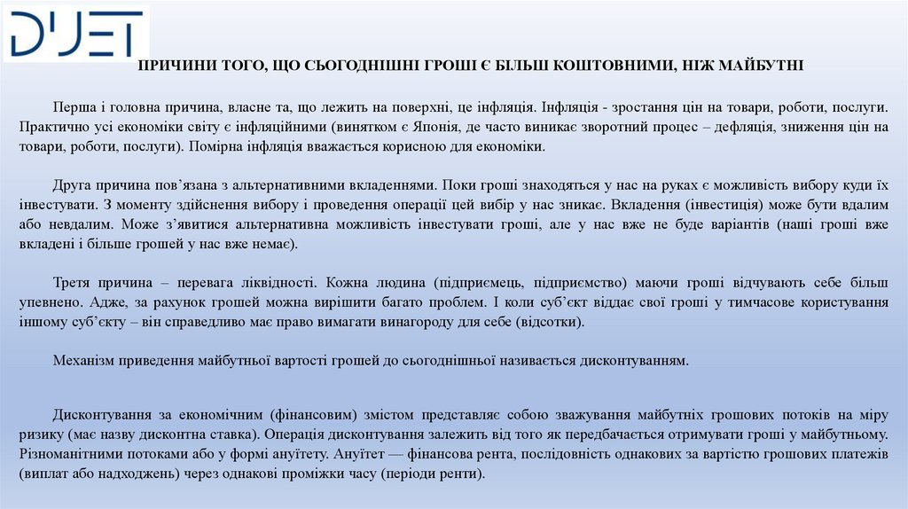 ПРИЧИНИ ТОГО, ЩО СЬОГОДНІШНІ ГРОШІ Є БІЛЬШ КОШТОВНИМИ, НІЖ МАЙБУТНІПерша і головна причина, власне та, що лежить на поверхні, це інфляція. Інфляція - зростання цін на товари, роботи, послуги.
