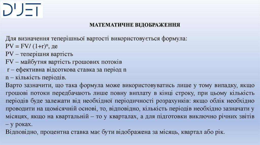 МАТЕМАТИЧНЕ ВІДОБРАЖЕННЯДля визначення теперішньої вартості використовується формула: