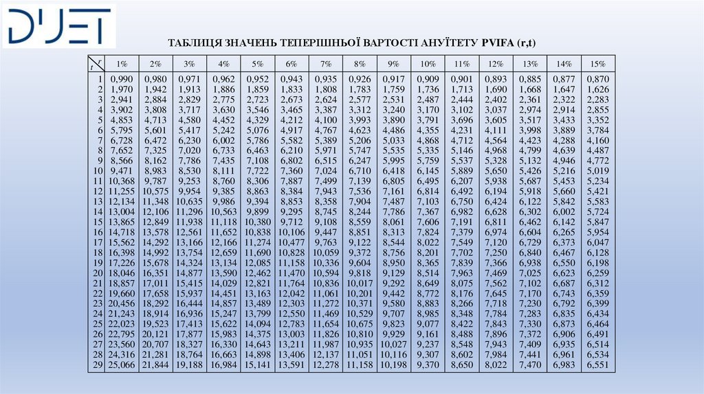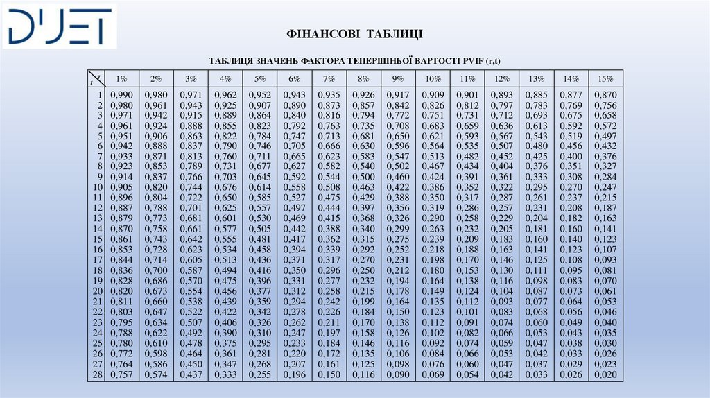 ФІНАНСОВІ ТАБЛИЦІТАБЛИЦЯ ЗНАЧЕНЬ ФАКТОРА ТЕПЕРІШНЬОЇ ВАРТОСТІ PVIF (r,t)