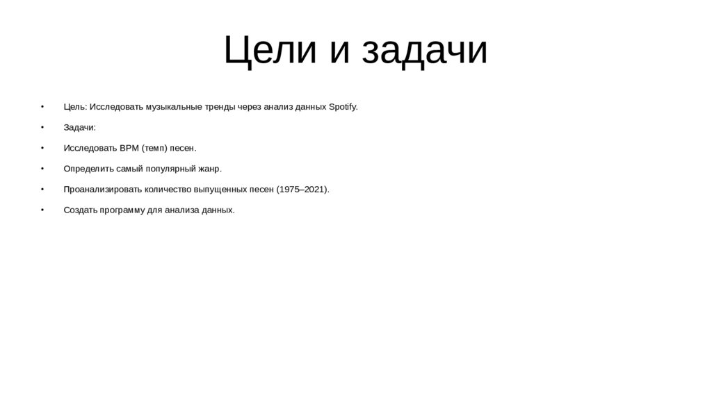 Цели и задачиЦель: Исследовать музыкальные тренды через анализ данных Spotify.