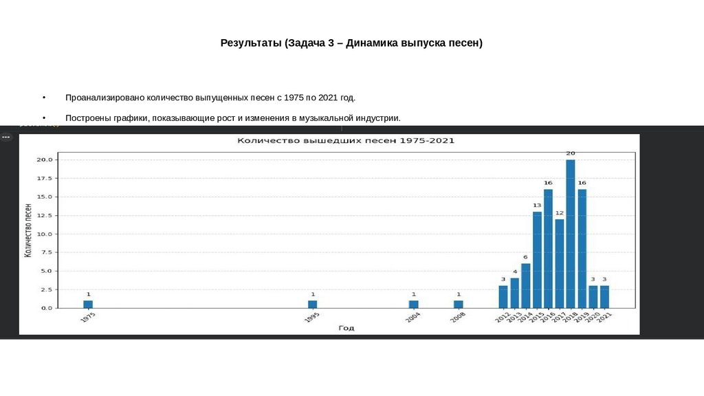 Результаты (Задача 3 – Динамика выпуска песен)Проанализировано количество выпущенных песен с 1975 по 2021 год.