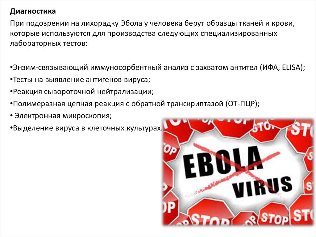ДиагностикаПри подозрении на лихорадку Эбола у человека берут образцы тканей и крови,