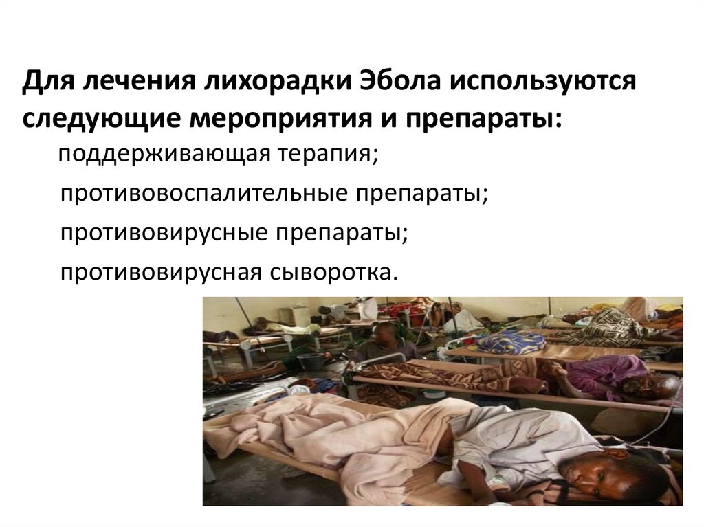 Для лечения лихорадки Эбола используютсяследующие мероприятия и препараты: