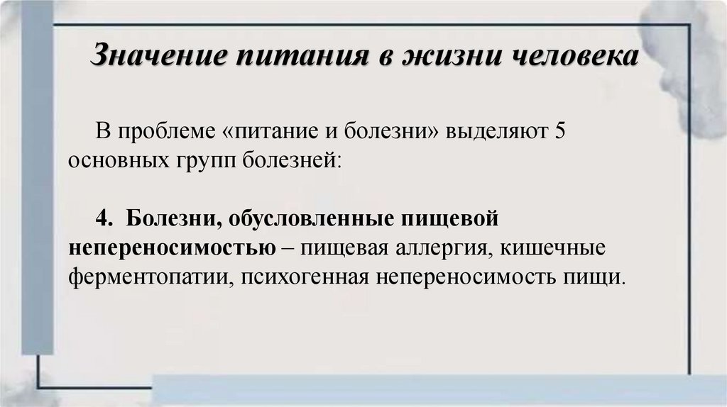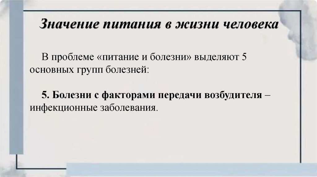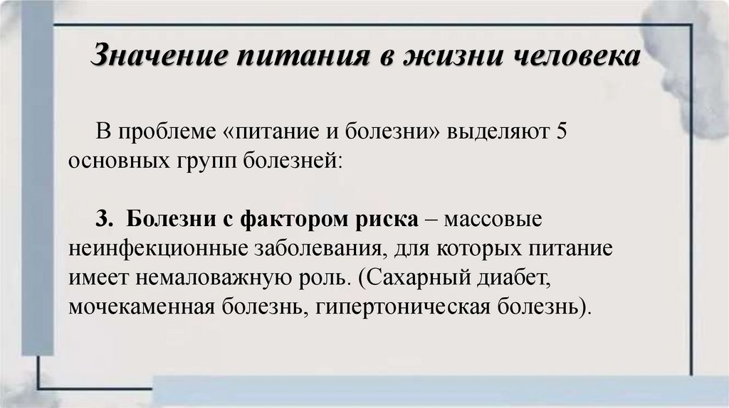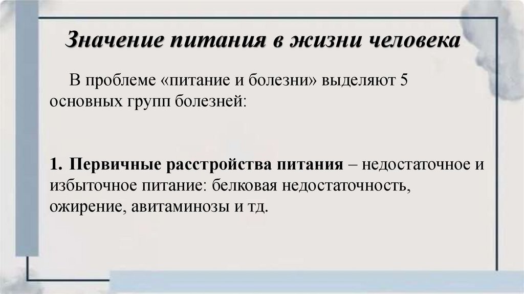 Значение питания в жизни человекаВ проблеме «питание и болезни» выделяют 5