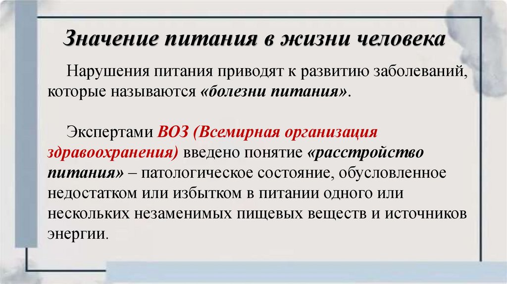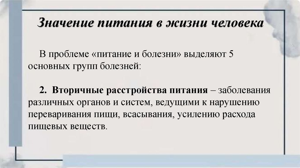 Значение питания в жизни человекаНарушения питания приводят к развитию заболеваний,