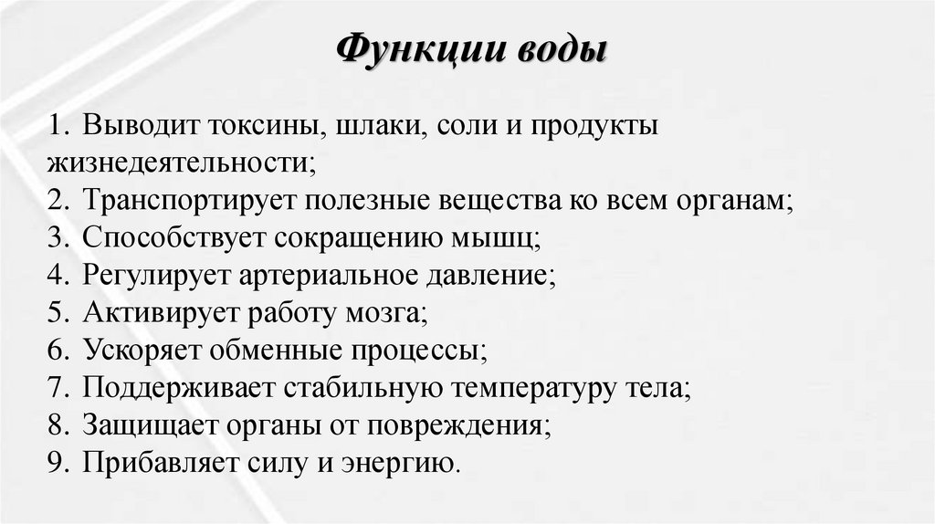 Функции воды1. Выводит токсины, шлаки, соли и продукты