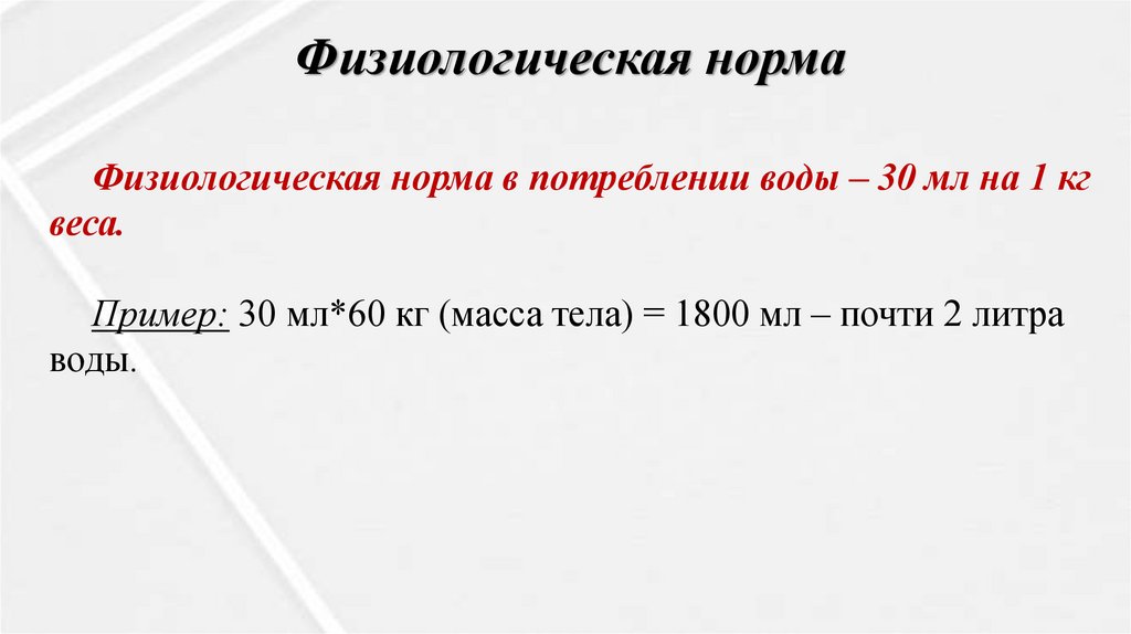 Физиологическая нормаФизиологическая норма в потреблении воды – 30 мл на 1 кг