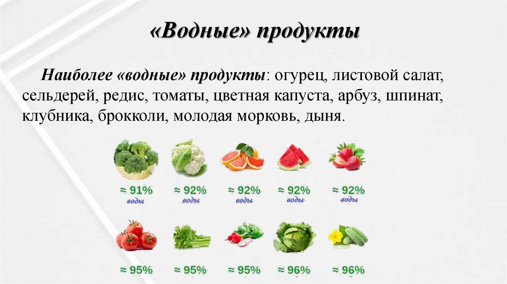 «Водные» продуктыНаиболее «водные» продукты: огурец, листовой салат,