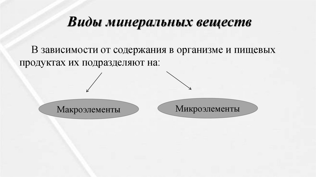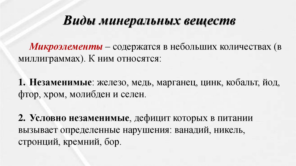 Виды минеральных веществМикроэлементы – содержатся в небольших количествах (в