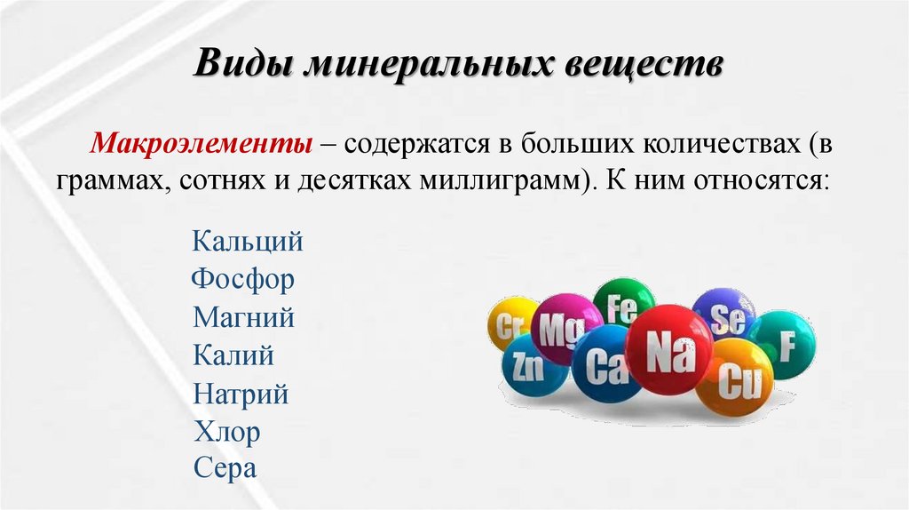 Виды минеральных веществМакроэлементы – содержатся в больших количествах (в