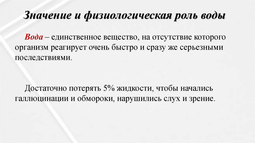 Значение и физиологическая роль водыВода – единственное вещество, на отсутствие которого