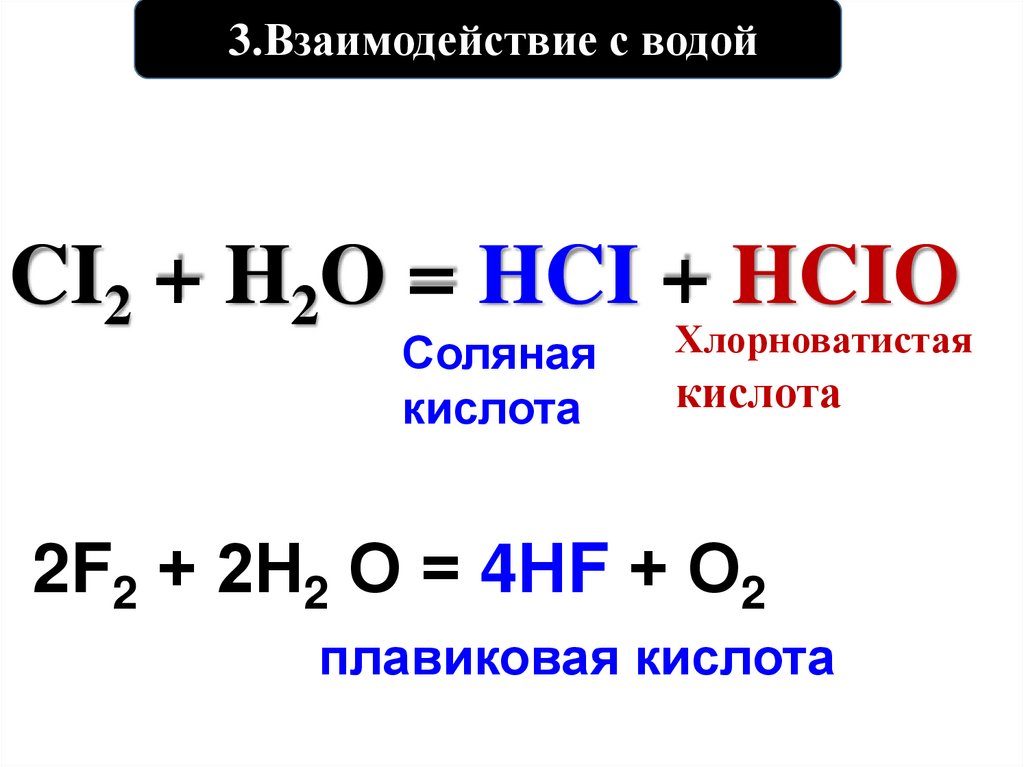 3.Взаимодействие с водойCI2 + H2O = HCI + HCIO
