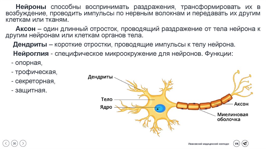 Нейроны способны воспринимать раздражения, трансформировать их ввозбуждение, проводить импульсы по нервным волокнам и передавать их другим