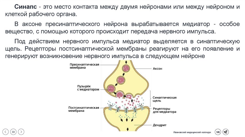 Под действием нервного импульса медиатор выделяется в синаптическую