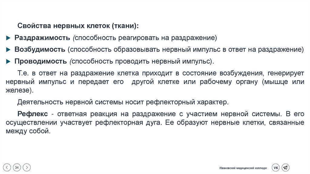 Свойства нервных клеток (ткани):Раздражимость (способность реагировать на раздражение)