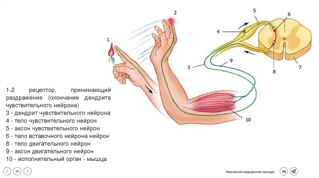 осуществлении участвует рефлекторная дуга. Ее образуют нервные клетки, связанные