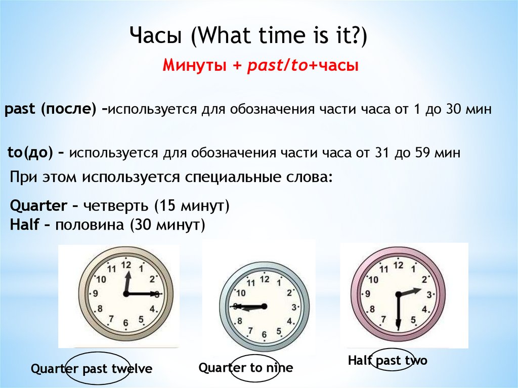 Часы (What time is it?)Минуты + past/to+часы