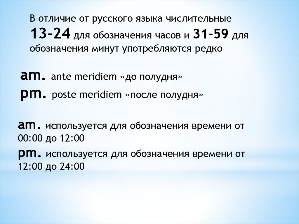 В отличие от русского языка числительные13-24 для обозначения часов и 31-59 для