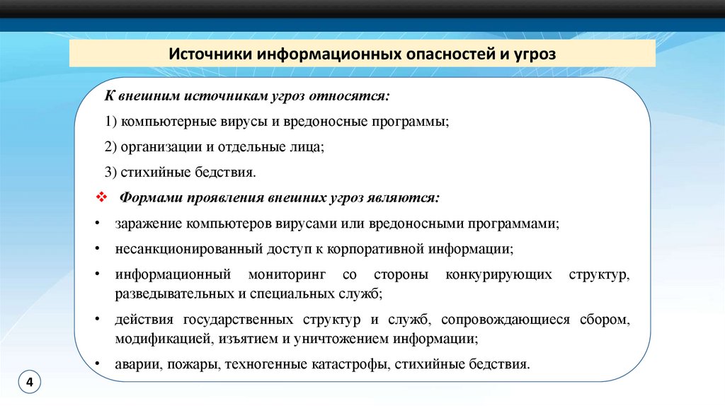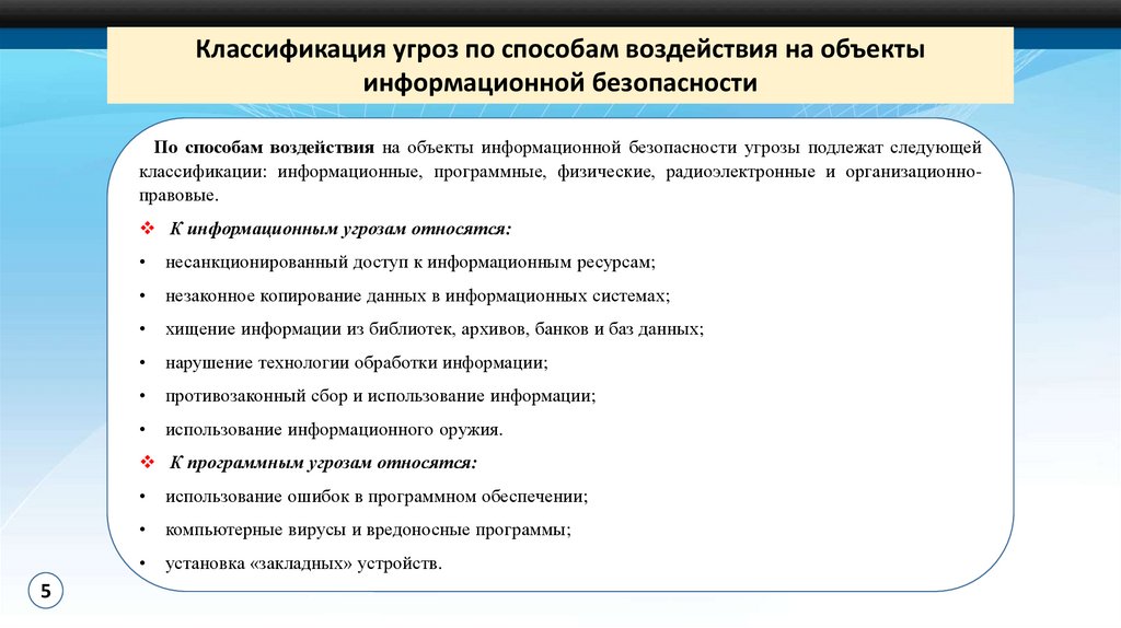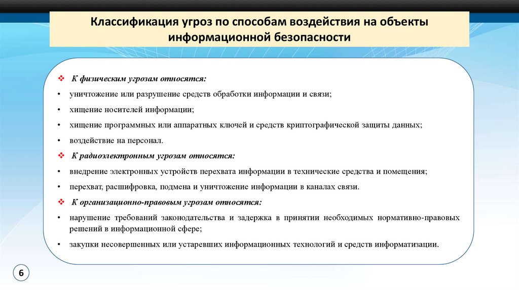 классификации: информационные, программные, физические, радиоэлектронные и организационноправовые.